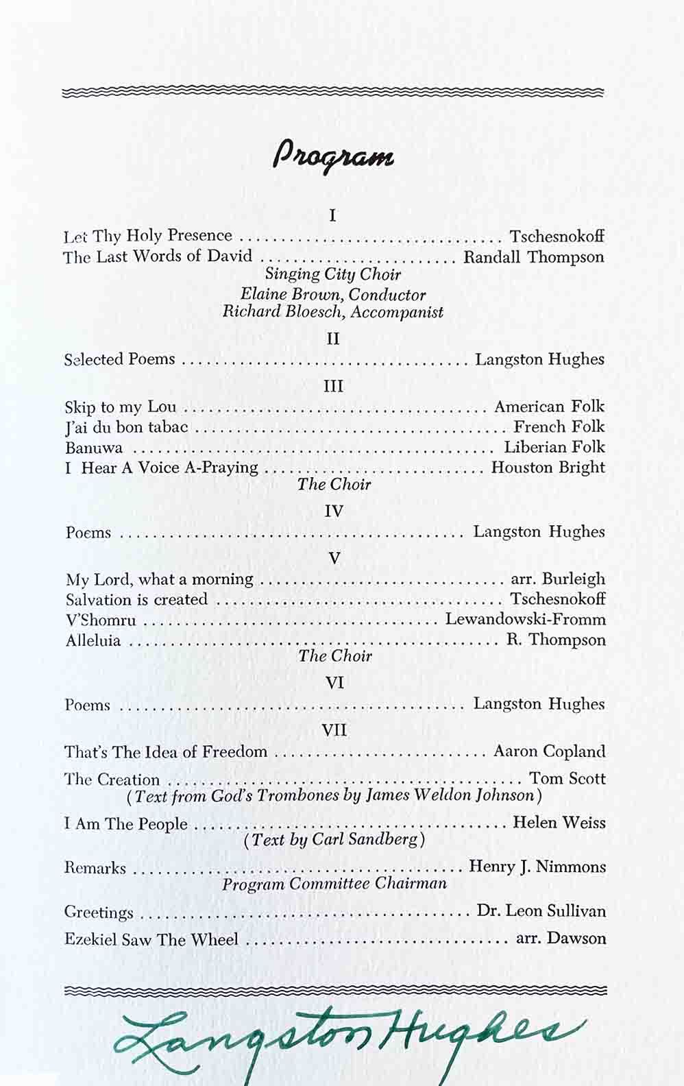 This collaboration also resonates deeply with Singing City’s own history. The choir first celebrated the work of Langston Hughes in May 1960, when it participated in a Philadelphia concert titled “An Evening with Langston Hughes and the Singing City Choir.” Presented under the leadership of the Rev. Dr. Leon H. Sullivan of Zion Baptist Church, the program featured Hughes reading his own poetry alongside choral works performed by Singing City under the direction of Elaine Brown. Materials from this historic concert are preserved in Singing City’s archives at Temple University, reflecting the ensemble’s early and sustained engagement with American poets and composers. The program, preserved in our archives, can be seen below.
